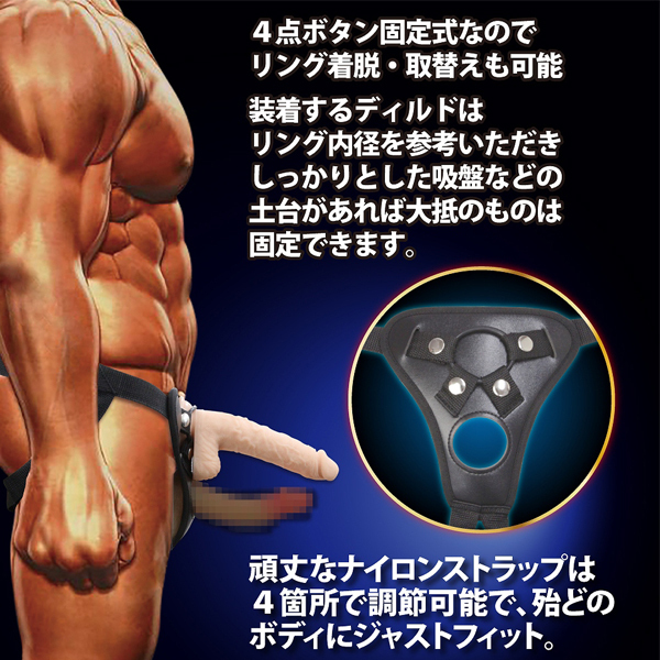 4つのボタンで吸盤ディルドをしっかり固定!玉袋付のものなら2箇所固定でより安定させられる♪夫婦やカップルで使用の際は、内径4.5cmの空いた穴から男性器を通せば2穴責めも可能です◎大中小の3サイズの付け替え用リング付属