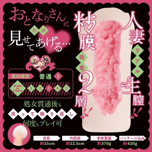 人妻でありながら処女という背徳感あふれる設定を忠実に再現し、驚きの処女膜ギミックを搭載!使用前には、優しく処女膜をいじり、膜が破ける瞬間をお楽しみください♪内部構造はリアルと妄想の絶妙なバランスで設計された2.5次元構造で、二層の粘膜感が驚くほどの生々しさを再現!非貫通タイプで、甘く優しいえっちタイムを存分にご堪能いただけます。